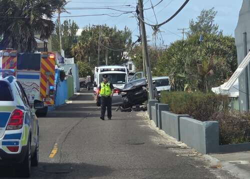 A car crashed into a roadside wall in the eastbound lane of North Shore Road in Pembroke near the junction with Overview Hill shortly before noon today, police reported.